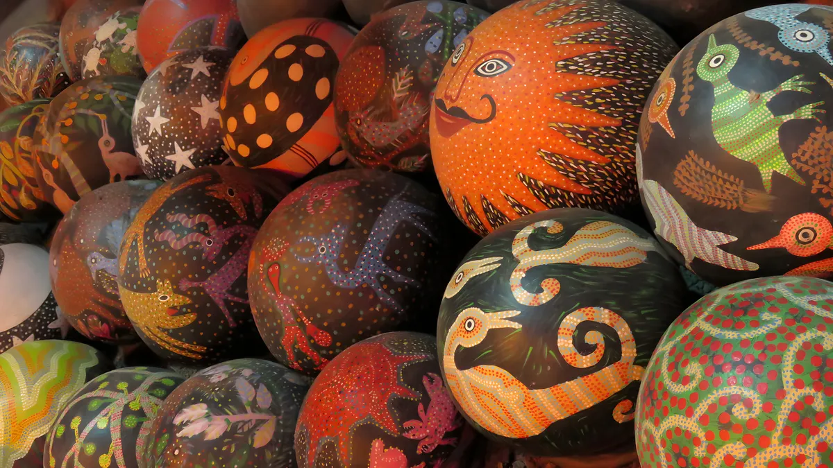 Description: This photograph captures a stunning display of matkas (traditional earthen pots) adorned with vivid tribal art, taken at the Tribal Arts Museum, Bhopal. Each pot is a canvas that tells a story illustrated with motifs inspired by nature, folklore, and tribal symbolism. The bold colours and intricate patterns reflect the rich cultural heritage of indigenous communities from Madhya Pradesh and neighbouring regions.